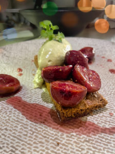 Poulpe snacké, crème de petits pois et légumes méditerranéens